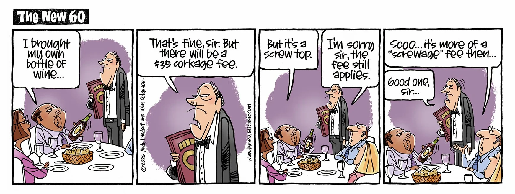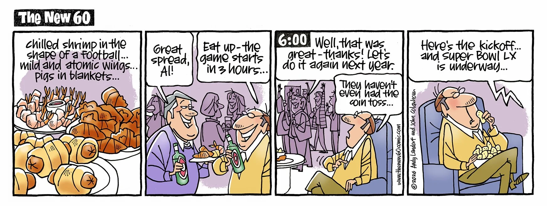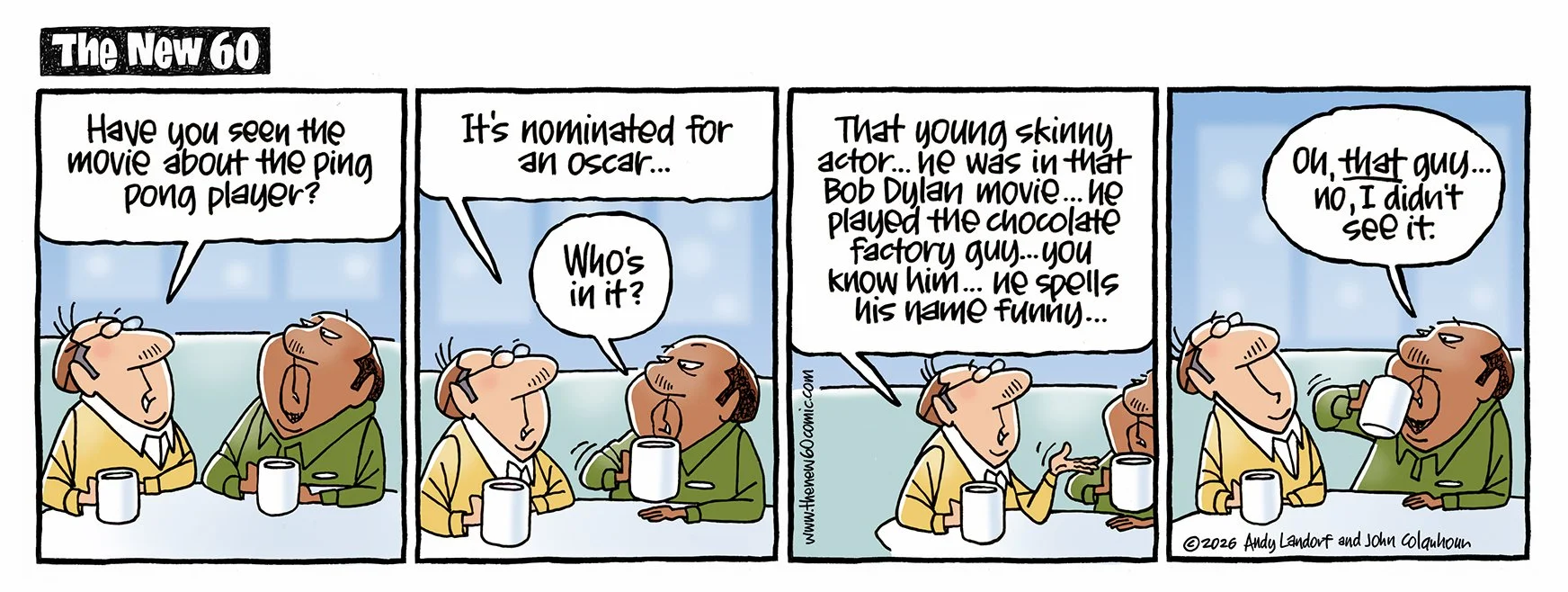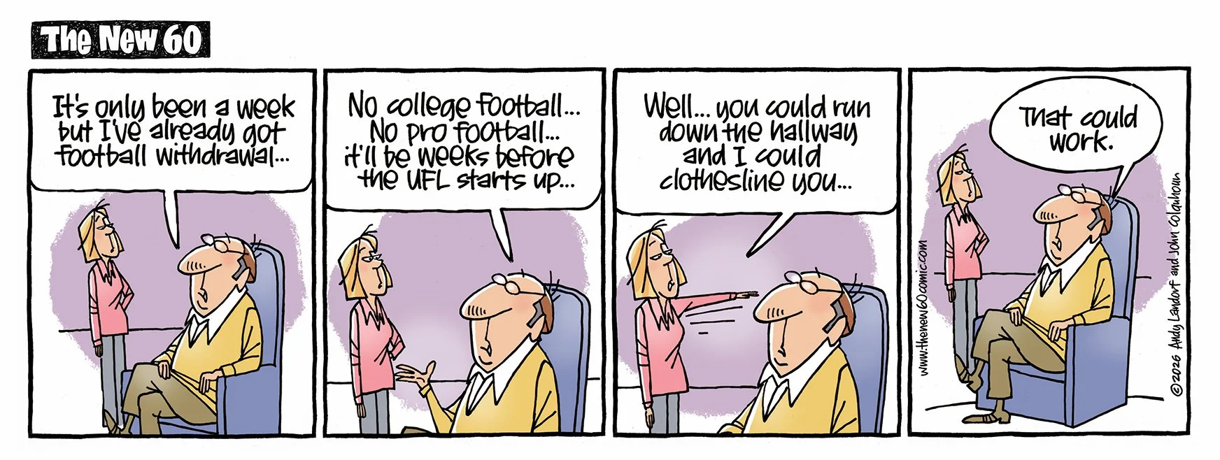 If you ARE 60, approaching 60, used to be 60, know someone who's 60, once bowled a 60... this comic strip is for you. Created by Andy Landorf and John Colquhoun- new cartoons every Tuesday and Friday.