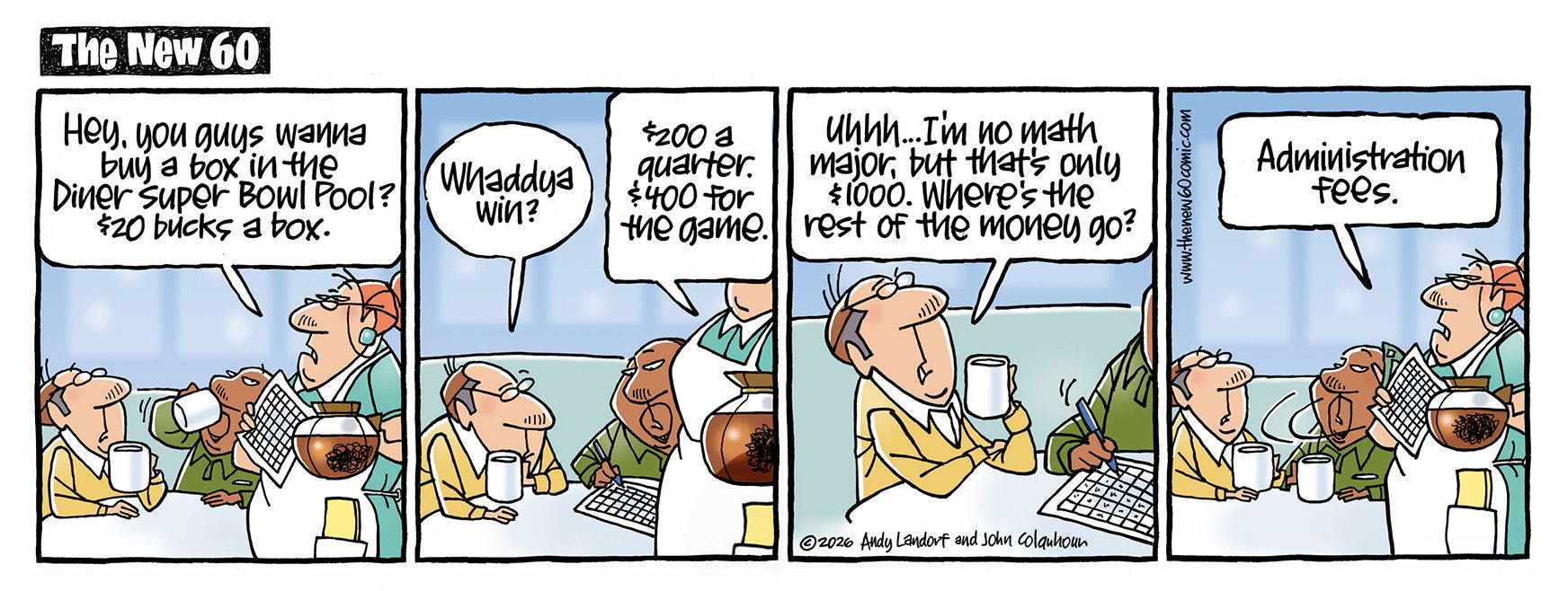 If you ARE 60, approaching 60, used to be 60, know someone who's 60, once bowled a 60... this comic strip is for you. Created by Andy Landorf and John Colquhoun- new cartoons every Tuesday and Friday.