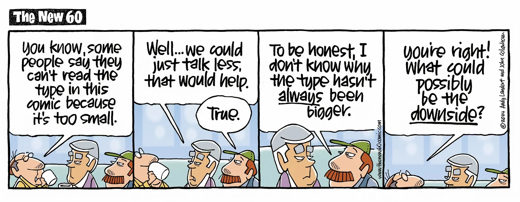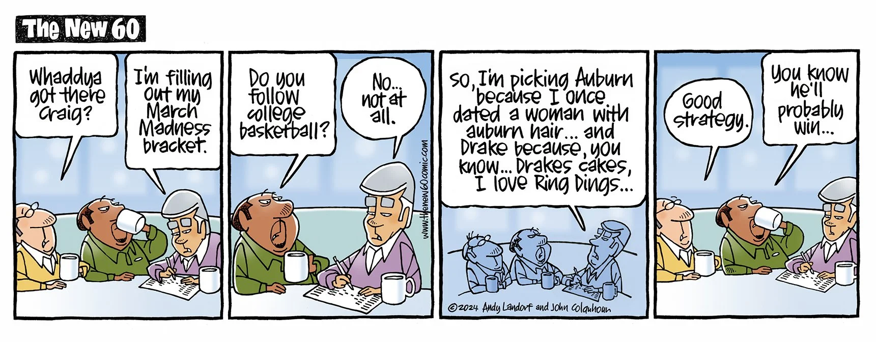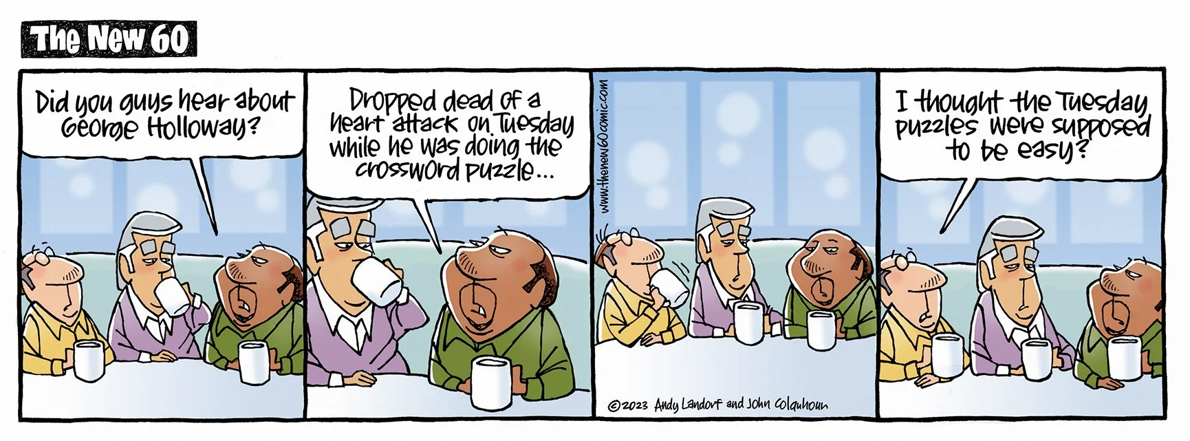 If you ARE 60, approaching 60, used to be 60, know someone who's 60, once bowled a 60... this comic strip is for you. Created by Andy Landorf and John Colquhoun- new cartoons every Tuesday and Friday.